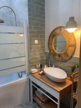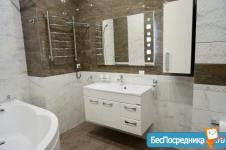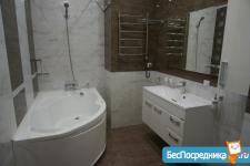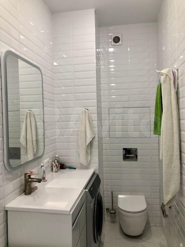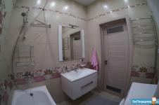 Санузел совмещенный, оформлен в современном стиле с использованием качественных материалов. В наличии стиральная машина и современная душевая кабина.